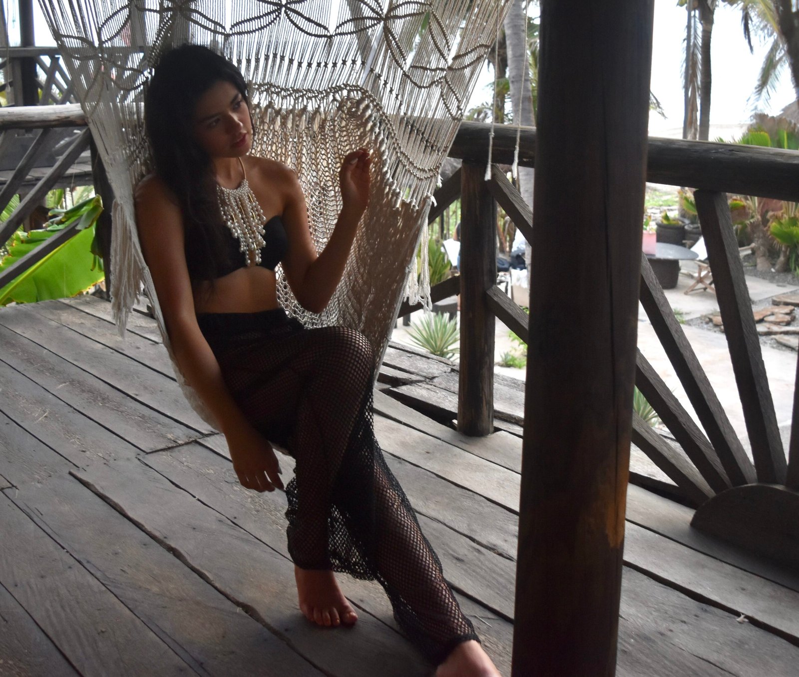 Eleva tu estilo playero con una pieza diseñada para capturar la esencia del movimiento. El Pantalón Marea Obscura combina la sobriedad del negro con una caída fluida que se adapta con naturalidad a tu figura, creando un juego de transparencias sutil que proyecta seguridad y una elegancia atemporal en cada paso.