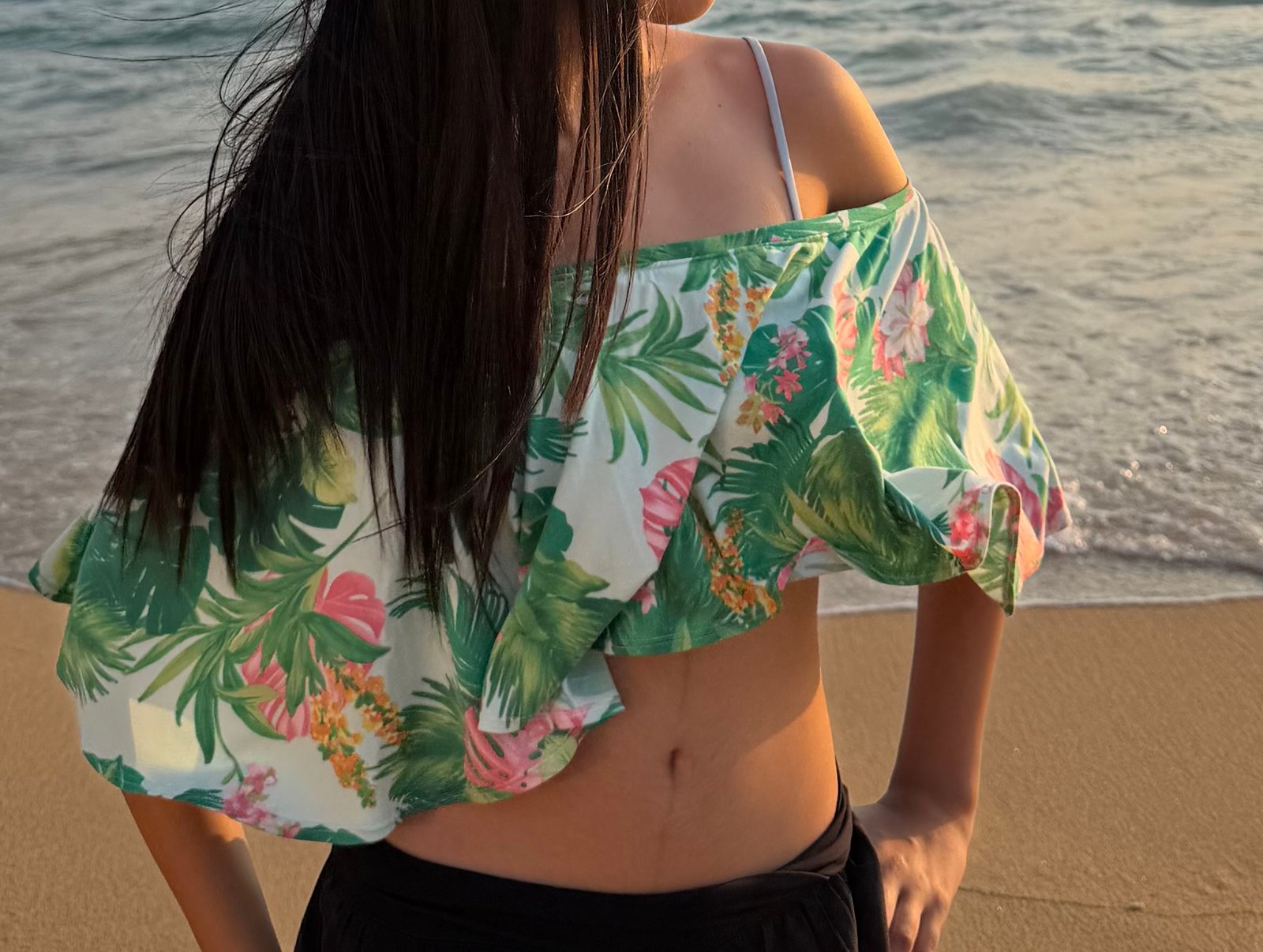 Dale vida a tu look con este top off-the-shoulder de diseño vibrante. Su corte de hombros descubiertos y detalles en volantes aporta un aire femenino y relajado, ideal para quienes buscan una prenda ligera y con mucha personalidad para sus días de sol o una tarde casual en la costa.